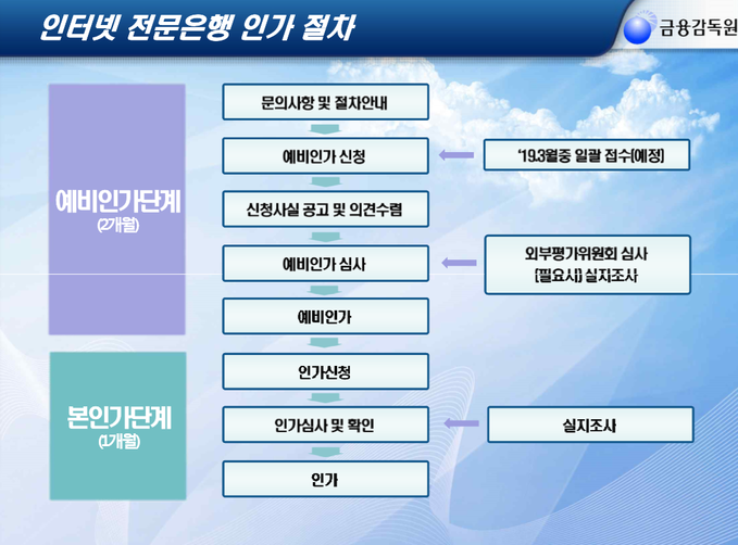 김병칠 금감원 은행총괄팀장은 "2월중 새로운 인가매뉴얼을 게시할 계획"이라며 "오는 3월 예비인가 신청을 받아 인터넷은행의 실질적인 영업 능력을 판단해 5월 쯤에 1~2개 신규 인가를 내줄 예정"이라고 말했다.
