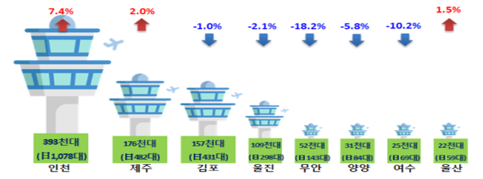 국토부 관할 8개 공항 관제탑에서 처리한 교통량은 △인천 39만3351대 △제주 17만5992대 △김포 15만7168대 △울진 10만8898대 △무안 5만2204대 △양양 3만548대 △여수 2만5307대 △울산 2만1531대 등의 순이었다.