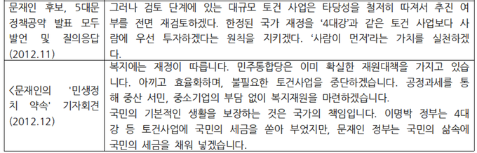 문 대통령은 2012년 11월 '5대문 정책공약 발표' 모두발언에서 검토 단계에 있는 대규모 토건 사업은 타당성을 철저히 따져서 추진 여부를 전면 재검토하겠다고 말한 바 있다.