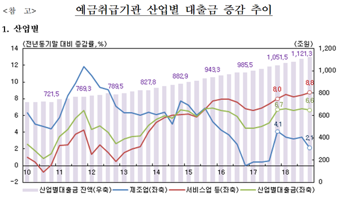 한국은행이 6일 발표한 '2018년 4분기 중 예금 취급기관 산업별 대출금'을 보면 작년 말 예금 취급기관의 전체 산업대출 잔액은 1121조2000억원이었다.