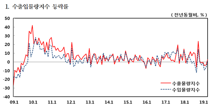 24일 한국은행이 발표한 '2019년 4월 무역지수 및 교역조건' 통계를 보면 지난달 수출물량지수는 전년 동기 대비 2.4% 상승했다.