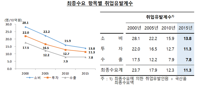 최종수요 항목별 취업유발계수를 보면 2015년 기준 소비가 13.8명으로 가장 높았고, 투자가 11.3명, 수출이 7.8명 순이었다. 2010년과 비교하면 소비(15.9→13.8명)에 의한 취업유발 효과가 가장 크게 줄었다.