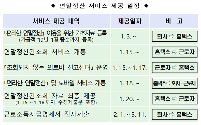 국세청은 18일부터 '편리한 연말정산 서비스'도 제공한다. 회사가 이 시스템을 활용한다면 근로자는 온라인으로 공제신고서를 작성해 제출할 수 있다. 예상세액을 간편하게 계산할 수도 있고 맞벌이 근로자 절세 방법도 안내받을 수 있다.