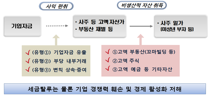 국세청은 이들 중 일부는 해외 현지법인 투자나 차명회사 거래 등 형식을 통해 회사 자산을 교묘히 빼돌리거나 미술품, 골드바 등 다양한 자산을 활용해 기업자금을 유출, 기업의 재무건전성을 해쳤다고 밝혔다.