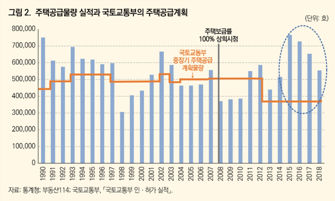 주택 인·허가 물량은 2015년 76만5328가구, 2016년 72만6048가구, 2017년 65만3411가구, 2018년 55만4136가구다. 이는 정부의 주택공급 계획물량과 비교하면 매우 높은 수준이다.