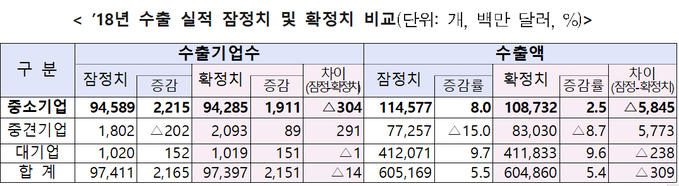 이 같은 차이는 통관실적의 변동과 지난해 새로 등록된 중견기업 변동에 따른 것이다. 지난해 중소기업에서 중견기업으로 성장한 300여개 중견기업의 수출실적을 반영하면 확정치와 잠정치의 실적은 거의 변동이 없다고 중기부는 설명했다.