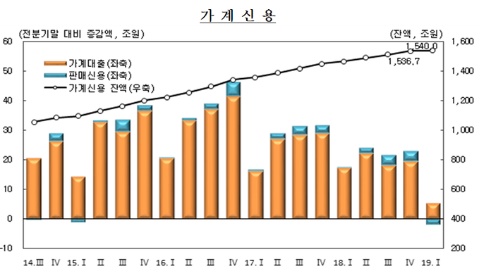 한국은행이 22일 발표한 '2019년 1분기 중 가계신용'을 보면 1분기 말 가계신용 잔액은 1540조 원으로 전분기 말(1536조7000억 원)보다 3조3000억 원 늘었다. 증가 폭은 2013년 1분기에 9000억 원 감소한 후 최소치다.
