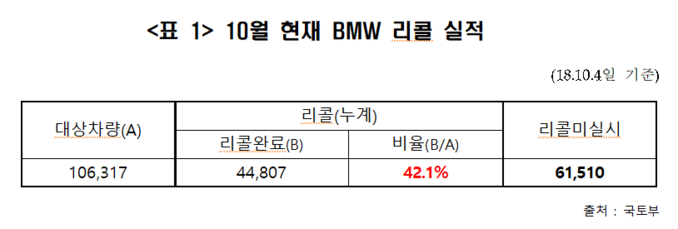 윤 의원은 BMW 리콜 완료율이 절반에 미치지 못하고 있다는 문제도 지적했다. 현재 BMW 리콜 완료율은 42.1%로 아직 리콜을 받지 않은 리콜 미실시 차량이 6만1510대에 달했다. 자동차안전연구원에서 BMW에 요구한 자료 133개 항목 중 33개가 아직도 제출되지 않아, 진상규명에도 어려움을 겪고 있다.