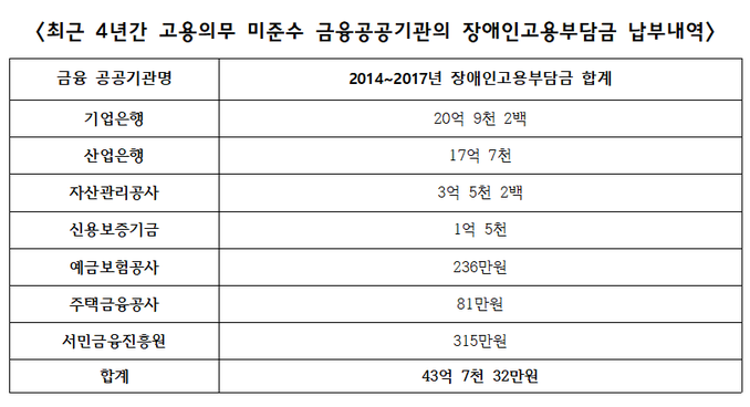 17일 국회 정무위원회 소속 김병욱 의원이 금융위원회로부터 제출받은 '금융공공기관 장애인고용 현황 및 중증장애인생산물 구매현황'에 따르면 2014년부터 2017년까지 금융공공기관들이 납부한 장애인 고용 부담금이 43억7032만원에 이르는 것으로 집계됐다.