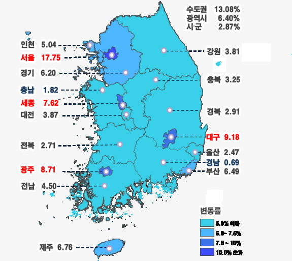 시·군·구별로는 서울 용산구가 35.4%로 최고 상승률을 기록했고 이어 강남(35.01%), 마포(31.24%), 서초(22.99%), 성동구(21.69%)가 뒤를 이었다. 서울 송파구, 종로구, 경기 성남 분당구, 서울 관악구, 성북구, 경기 과천시, 서울 광진구, 경기 안양동안구, 광주 남구 등은 전국 평균 상승률(9.13%)을 상회했다.