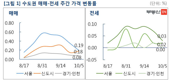 8일 부동산114에 따르면 10월 첫 주 서울 아파트 매매가격은 지난달 21일 대비 0.19%의 변동률을 기록했다. 9·13, 9·21 등 정부의 연이은 고강도 대책 이후 3주 연속 상승폭이 크게 둔화된 것이다. 서울과 인접한 평촌, 판교 등 신도시 아파트값은 0.18%, 경기·인천은 0.08% 상승하는 데 그쳤다.