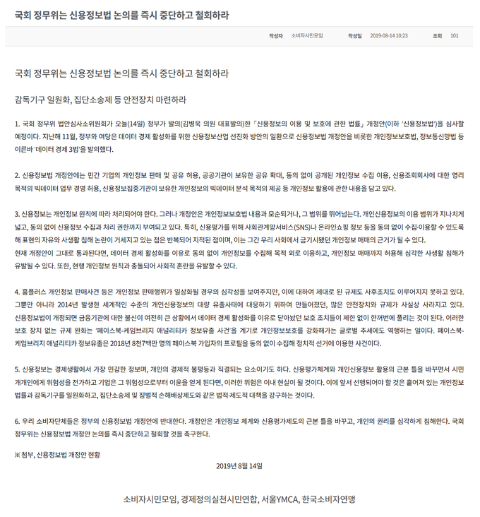그러면서 "국회는 개인의 권리를 심각하게 침해하는 신용정보법 개정안에 대한 논의를 즉시 중단하라"고 요구했다.