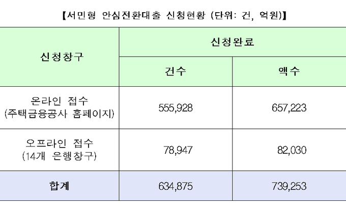 이달 16일부터 29일까지 접수 결과 안심대출 전환 신청은 총 63만5000건, 금액으로 따지면 73조9000억 원이었다. 이는 당국이 최초 공급하기로 약속한 20조 원의 3.7배에 해당하는 금액이다.