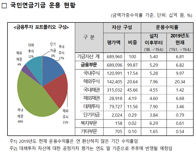 기금운용본부는 "4월까지의 기간 수익률이 6.81%를 기록한 것은 글로벌 경기 둔화 우려에도 불구하고 무역협상 진전 기대 및 미국 금리인상 기조 완화 등으로 국내 및 글로벌 증시가 강세를 보였고 국내 경제지표 부진 등의 영향으로 원·달러 환율이 상승했기 때문"이라고 분석했다.