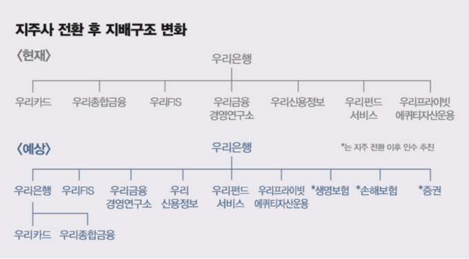 금융권에서는 우리은행이 지주사로 전환하면 현재 7000억원에 불과한 출자 여력이 10배 정도 늘 것으로 전망하고 있다. 현행 은행법에 따라 은행은 자기자본의 20%밖에 출자할 수 없지만 지주사로 전환하면 130%까지 출자가 가능하기 때문이다.
