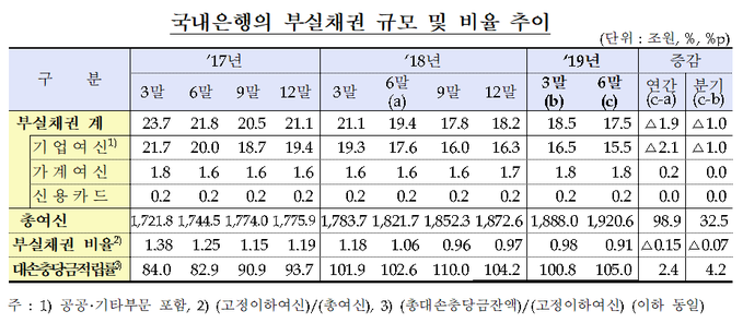 금융감독원이 20일 발표한 '2019년 2분기말 국내은행의 부실채권 현황'에 따르면 올 2분기말 기준 국내은행 총 19곳의 부실채권비율은 0.91%로 전분기말(0.98%) 대비 0.07%포인트 떨어졌다.