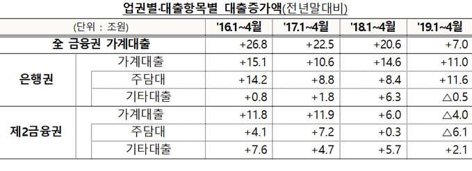 업권별로는 은행권 대출이 319조 원, 제2금융권 대출이 86조9000억 원(상호금융 60조4000억 원, 여신전문금융회사 12조4000억 원, 저축은행 13조6000억 원, 보험사 4000억 원)이다.
