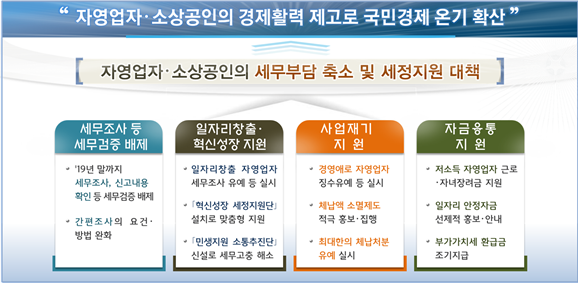 최근 내수부진 등으로 어려움을 겪고 있는 569만 자영업자와 소상공인에 대한 세무조사와 신고내용 확인이 내년 말까지 한시적으로 유예된다.