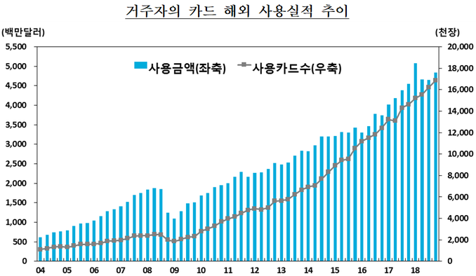 현금보다 카드를 쓰는 경향이 늘어난 점도 한 요인으로 지목된다. 해외에서 사용한 카드 수는 6384만장으로 전년보다 15.6% 늘었다. 카드 한 장당 사용 금액은 3% 감소한 301달러로 집계됐다.