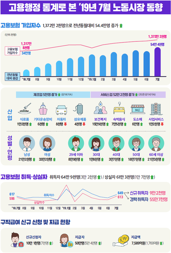 고용노동부가 12일 발표한 '고용행정 통계로 본 7월 노동시장의 주요 특징'에 따르면 지난달 구직급여 지급액은 7589억 원으로, 작년 동월(5820억원)보다 30.4% 증가했다.