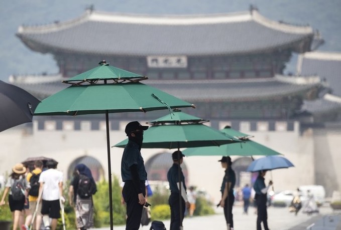▲ 전국 대부분 지역에 폭염특보가 내려진 20일 서울 광화문광장에서 경찰이 경계근무를 서고 있다. [연합뉴스 제공]