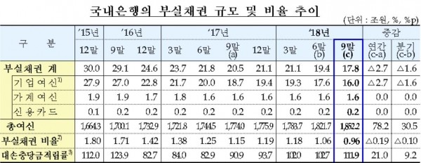 국내은행의 부실채권비율은 2015년말 1.8%, 2016년말 1.42%, 지난해말 1.19% 등으로 꾸준히 개선됐는데, 1% 아래로 떨어진 것은 지난 2008년 3분기말(0.82%) 이래 처음이다. 국내은행들의 자산건전성이 글로벌 금융위기 이전 수준으로 회복됐다는 의미로 해석된다.