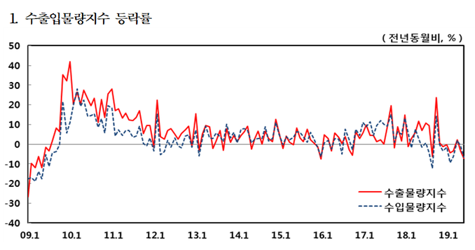 LCD와 컴퓨터 주변기기, 정밀기기 등을 중심으로 컴퓨터, 전자및광학기기(-8.7%)의 수출물량지수가 하락했다. 이외에 화학제품(-6.2%), 석탄및석유제품(-12.6%)의 경우에는 글로벌 수요 둔화와 특정 원료의 수출 감소로 수출물량지수의 하락폭을 키웠다.