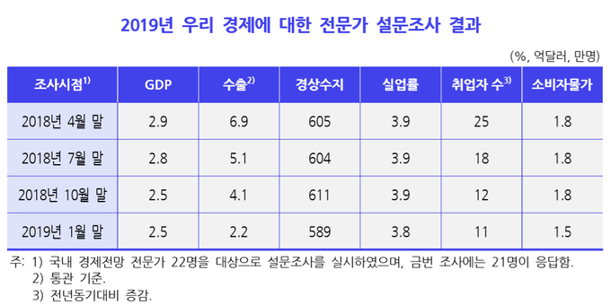 KDI가 국내 경제 전망 전문가 22명을 상대로 설문조사(21명 응답)한 결과 응답자들은 올해 한국 경제 성장률이 평균 2.5%를 기록할 것이라고 전망했다. 정부는 올해 성장률을 2.6∼2.7% 수준으로 예상했다.