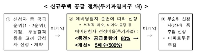 국토부 관계자는 "예비당첨자가 대폭 늘면, 최초 당첨자가 계약을 포기할 경우 실수요자인 1·2순위 내 후순위 신청자의 계약 기회가 커져 계약률도 높아지고, 무순위 청약 물량도 최소화할 것"이라고 밝혔다.