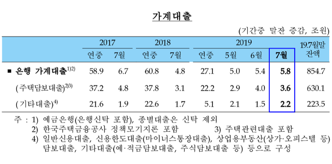중소기업 대출도 중소법인들의 외상매출채권담보대출 상환이 6월말에서 7월초로 연기된 영향으로 전월대비 2조6000억 원 증가하는 데에 그쳤다. 지난해 12월(-4조4000억 원) 이후 7개월 만에 가장 적었다. 그 중 자영업자가 주로 빌리는 개인사업자 대출은 2조 원 늘어 전월(1조7000억 원)보다 증가규모가 커졌다.