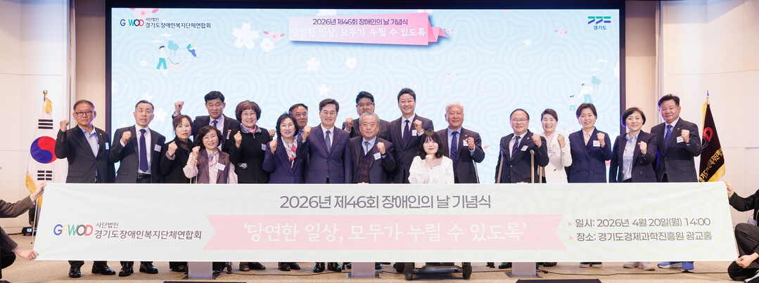 ▲ 20일 경기도경제과학진흥원 광교홀에서 열린 제46회 장애인의 날 기념식에서 김동연 경기지사를 비롯한 참석자들이 기념촬영을 하고 있다. [경기도 제공]