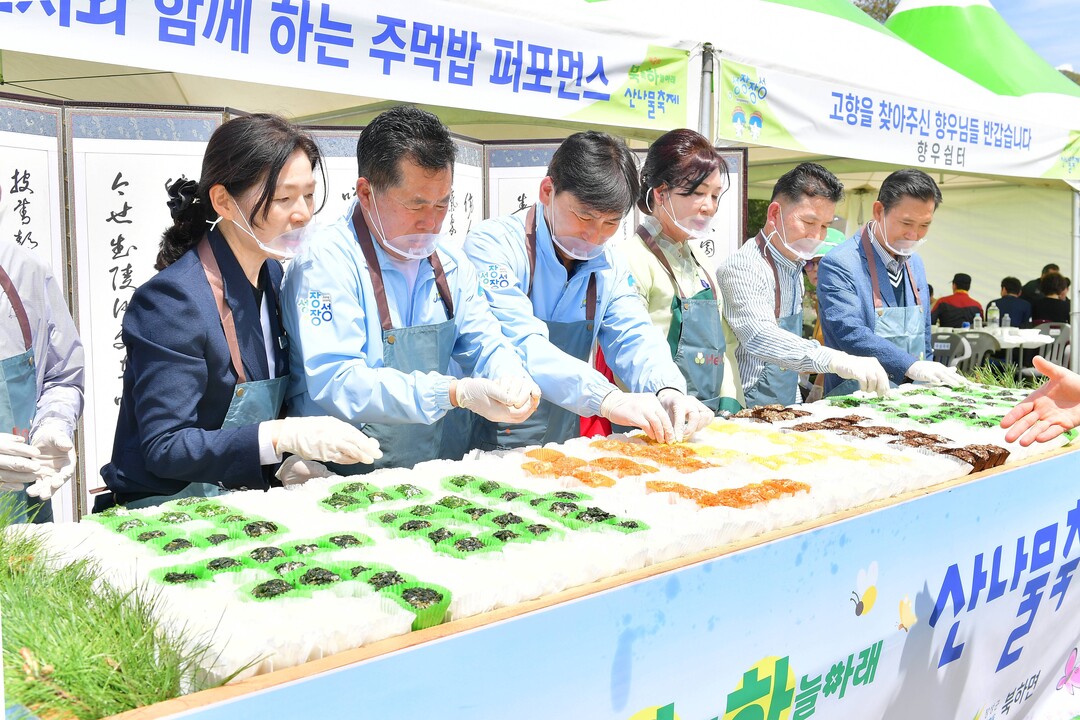 ▲ 심우정 장성군 부군수가 지난 18일 북하면에서 열린 '북쪽 하늘아래 산나물 축제'에서 주먹밥 퍼포먼스를 하고 있다. [장성군 제공]