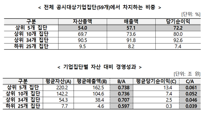 상위 34개 집단과 하위 25개 집단으로 나눠 봤을 때 상위 34개 집단의 비중은 자산 90.5%, 매출액 91.8%, 당기순이익 92.6%인데 비해 하위 25개 집단은 자산 9.5%, 매출 8.2%, 당기순이익 7.4%에 그쳤다.