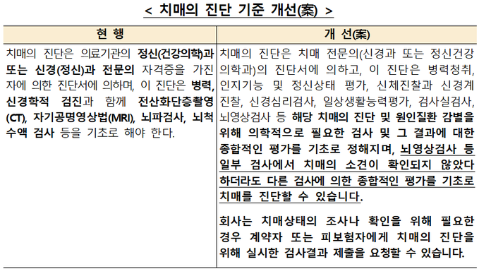 개선안은 '뇌영상검사(CT·MRI) 등 일부 검사에서 치매 소견이 확인되지 않았다 하더라도 다른 검사에 의한 종합적인 평가를 기초로 치매를 진단할 수 있다'고 규정했다.