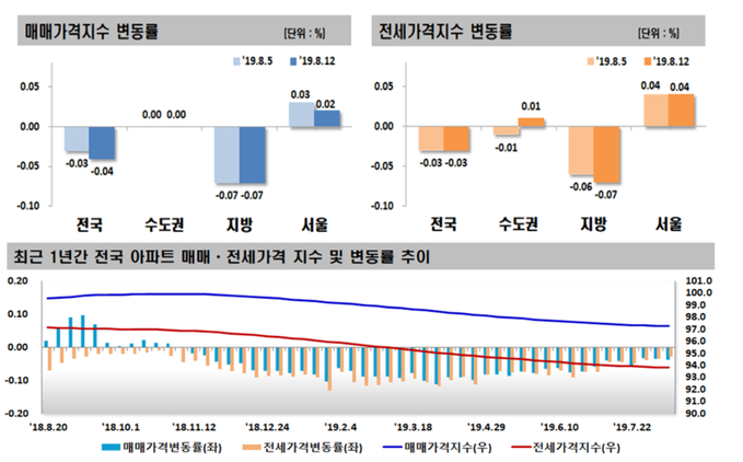 지방에선 대전(0.15%), 전남(0.02%)이 올랐고 강원(-0.25%), 제주(-0.16%), 경남(-0.15%) 등은 하락했다.