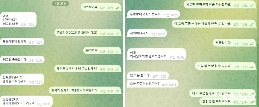 기자는 실제 약물이 거래되는지 확인하기 위해 구매자인 척 대화를 나눴다. 안내받은 텔레그램 계정으로 메시지를 보내자 다른 계정으로 판매자가 대화를 걸어 왔다. 이 과정은 그리 오래 걸리지 않았다. 실제로 구매자들의 문의가 활발히 이뤄지고 있음을 시사하는 대목이다.