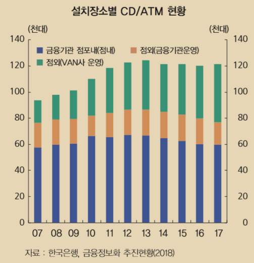 대신 빈 자리는 부가통신사업자(VAN사)가 운영하거나 일부 은행이나 영업점이 없는 인터넷전문은행이 제휴해 VAN사와 운영하는 기기가 대체했다. VAN사 등이 운영하는 ATM은 2013년 말 3만 7426대에서 2017년 말 4만 4737대로 7311대 늘었다.
