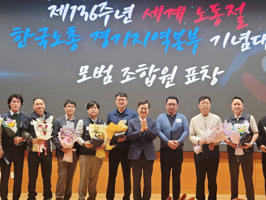 ▲ 30일 한국노총 경기본부에서 열린 제136주년 세계노동절 기념대회에서 김동연 경기도지사가 수상자들과 함께 기념촬영을 하고 있다. [김동연 sns 캡처]