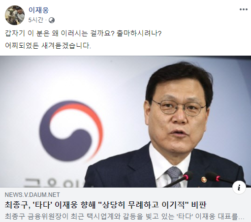 최종구 금융위원장이 택시업계와 '타다' 갈등을 언급하며 이재웅 쏘카 대표를 "무례하고 이기적"이라고 비난하자 이 대표가 즉각 받아쳤다.