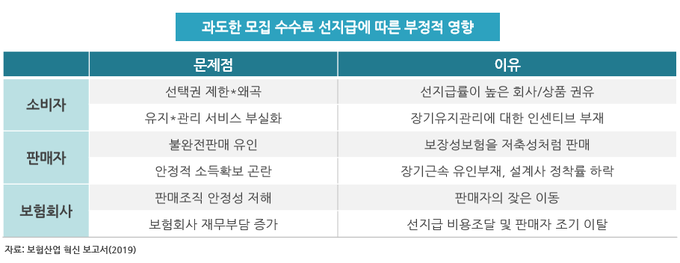 정 연구위원은 "모집조직이 계약자의 필요보다 수수료를 더 많이 지급하는 상품을 권유할 가능성이 있다"며 "초기에 과다하게 지급하는 모집수수료 수준을 개선하고, 모집조직이 1년간 수령하는 수수료를 연(年) 납입 보험료 이하로 조정해야 한다"고 말했다.