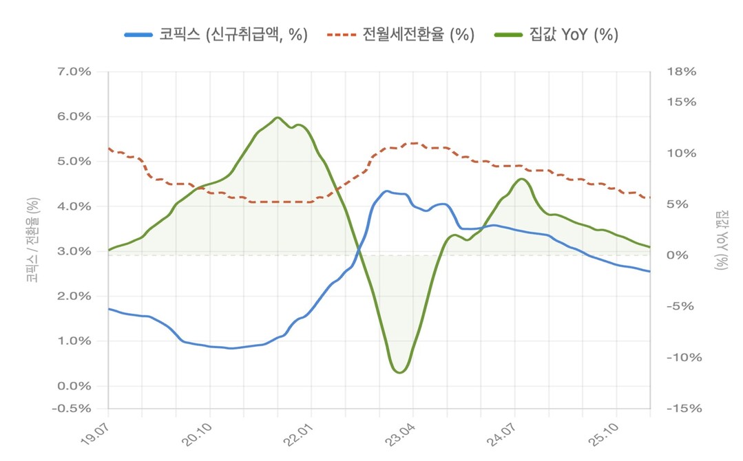 이 같은 단기적 '미스매치' 위에 금리 환경 변화가 겹치면서 월세 전환 흐름이 빨라지고 있다는 분석이다. 금리가 오르면 전세대출 부담이 커지고, 집주인 역시 안정적인 현금 흐름을 선호하게 되면서 월세 전환이 늘어난다. 실제 전월세전환율은 기준금리와 코픽스 변동에 따라 4%대 초반에서 5%대 중반까지 움직이며 상승 흐름을 보였다.