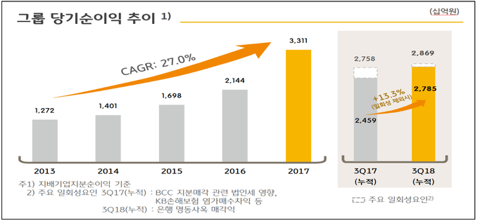 KB금융그룹 관계자는 "주식시장 부진과 보험 손해율 상승 영향으로 비은행 계열사의 순이익 규모가 전 분기보다 다소 축소됐다"며 "투자은행(IB) 부문 시장 경쟁력을 높여 수수료 기반을 확대해 나가겠다"고 말했다.