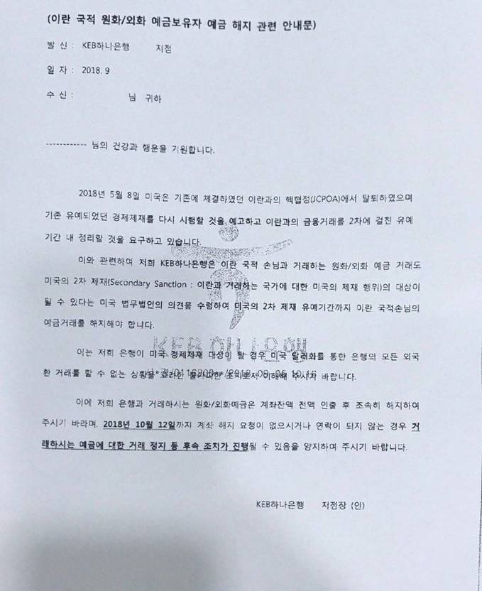 7일 금융권에 따르면 KEB하나은행은 지난달 초 이란인 고객에게 10월 12일까지 계좌를 해지해달라고 전화와 우편 등을 통해 요청했다. 10월 31일자로 이란인 계좌의 입출금 거래가 제한됐고 현재는 계좌 해지만 가능하다.