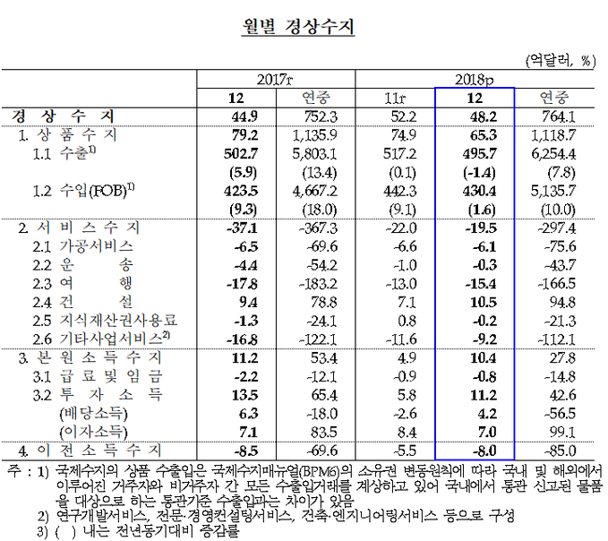 한국은행이 15일 발표한 '2018년 12월 국제수지(잠정)'를 보면 지난해 경상수지는 764억1000만달러 흑자였다. 경상수지는 외환위기가 닥쳤던 1998년 이후 연속 흑자 기록을 이어갔다. 흑자 폭도 전년(752억3000만달러)보다 확대했다.