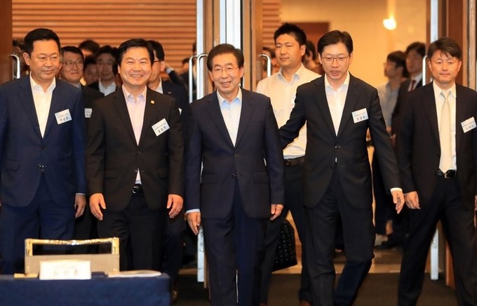 ▲ 25일 오전 서울 중구 대한상공회의소에서 열린 '소상공인 수수료 부담 제로 결제서비스' 도입을 위한 업무협약식에서 박남춘 인천시장(왼쪽부터), 홍종학 중소벤처기업부 장관, 박원순 서울시장, 김경수 경남지사 등이 행사장으로 들어서고 있다. [연합뉴스 제공]