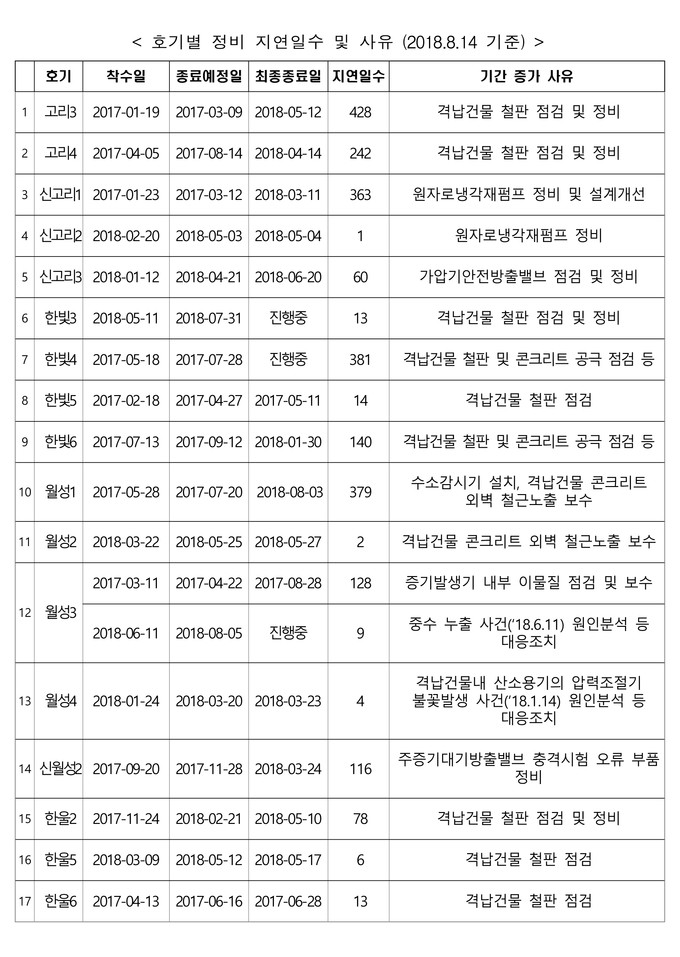실제로 고리 3·4호기는 격납건물 철판 정비가 지연 원인이었으며, 신고리 1·2호기는 원자로냉각재펌프 정비, 신고리 3호기는 가압기안전방출밸브를 정비해야 했다.