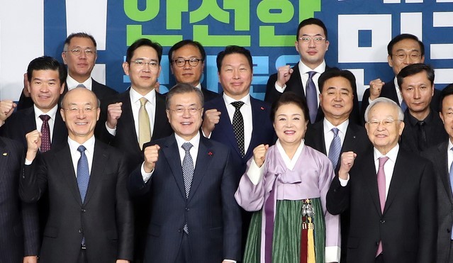 ▲ 삼성·현대·SK·LG 국내 4대 기업 총수 등이 2일 오전 서울 여의도 중소기업중앙회에서 열린 문재인 대통령 초청 신년회에서 주먹을 불끈 쥔채 기념사진을 찍고 있다. 정의선 현대자동차그룹 수석 총괄부회장(왼쪽 뒷줄 두번째), 이재용 삼성전자 부회장(〃 세번째), 최태원 SK그룹 회장(〃 다섯번째), 구광모 LG그룹 회장.(〃여섯번째) [뉴시스]