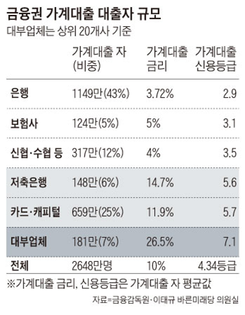 실제로 이태규 의원실이 분석한 결과 시중은행에서 가계 대출을 받는 사람들의 평균 신용등급은 2.9등급이었고 평균 가계대출 금리는 3.72%였다. 반면 저축은행 대출자의 평균 신용등급은 5.6등급이었고 평균 대출 금리는 14.7%에 이르는 것으로 나타났다. 대부업체 이용자의 평균 신용등급은 7.1등급, 평균 대출금리는 26.5%에 이른다.