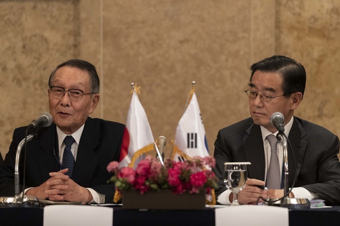 ▲ 사사키 미키오(왼쪽) 일한경제협회 회장이 25일 오후 서울 중구 롯데호텔에서 열린 '제51회 한일경제인회의' 공동기자회견에 참석해 취재진의 질문에 답변하고 있다. [문재원 기자]