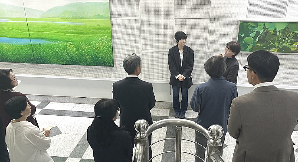 ▲ 시청 갤러리 전시 개막 행사에서 참석자들이 작품 앞에 모여 작가의 설명을 경청하고 있다. [밀양시 제공]